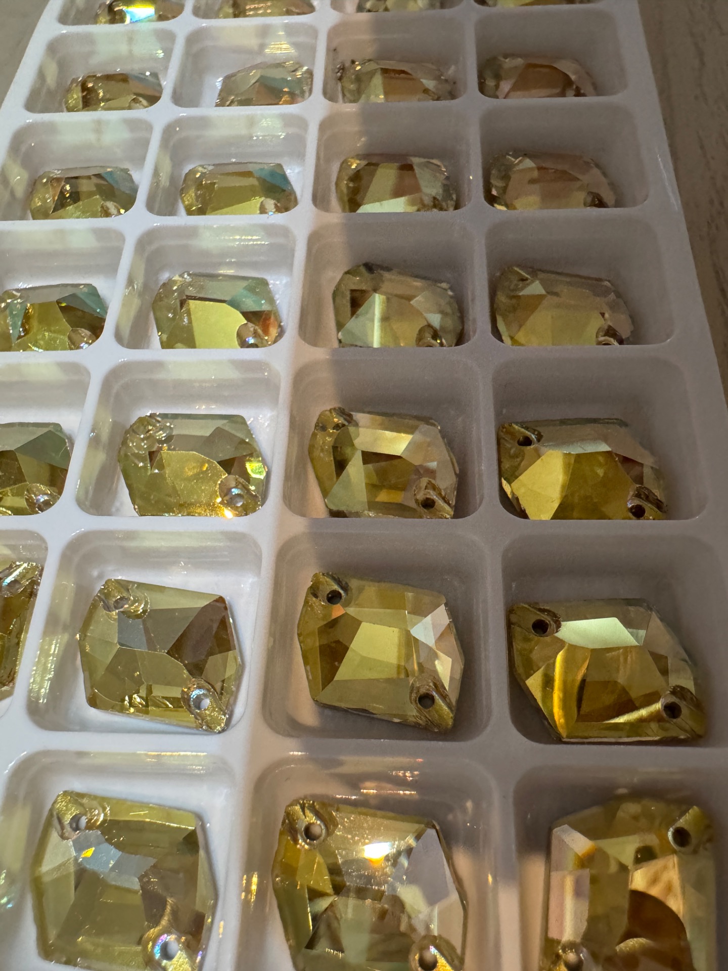 Modelo Irregular.En CRISTAL ALTA CALIDAD Color Amarillo Dorado Medidas: 10x18mmRespaldo Plano 2 agujeros para coser