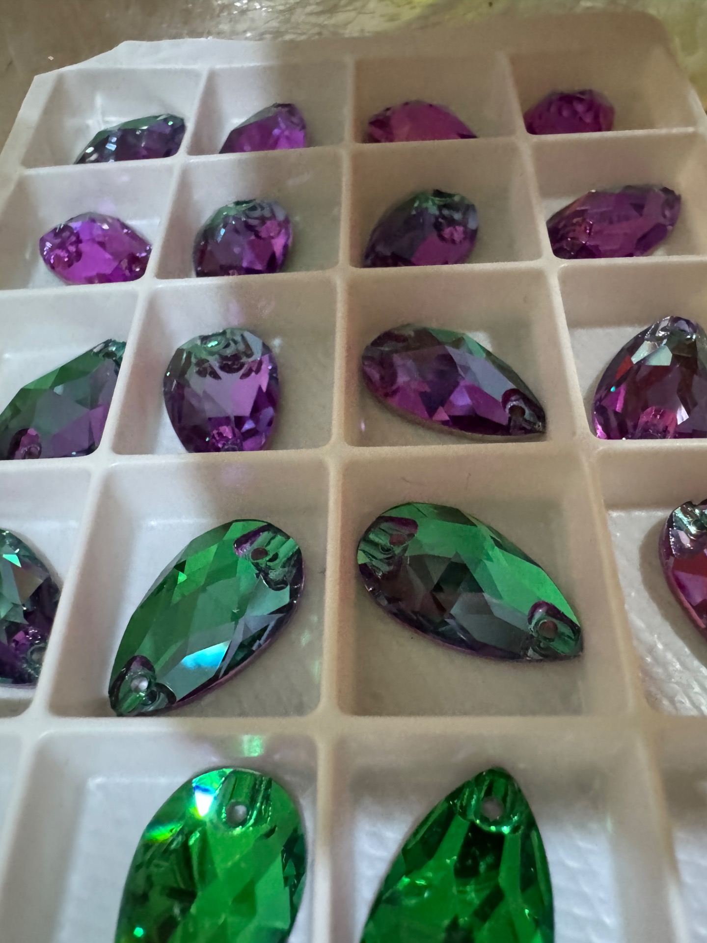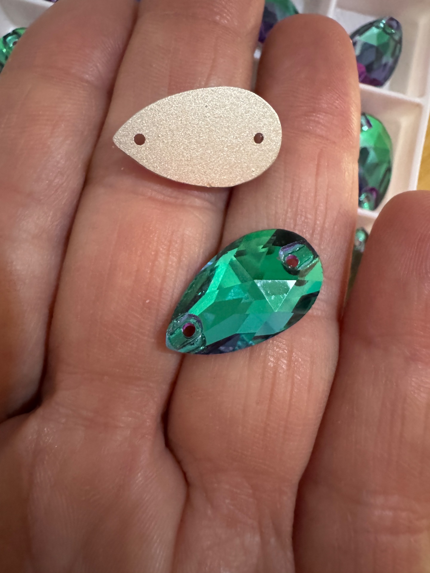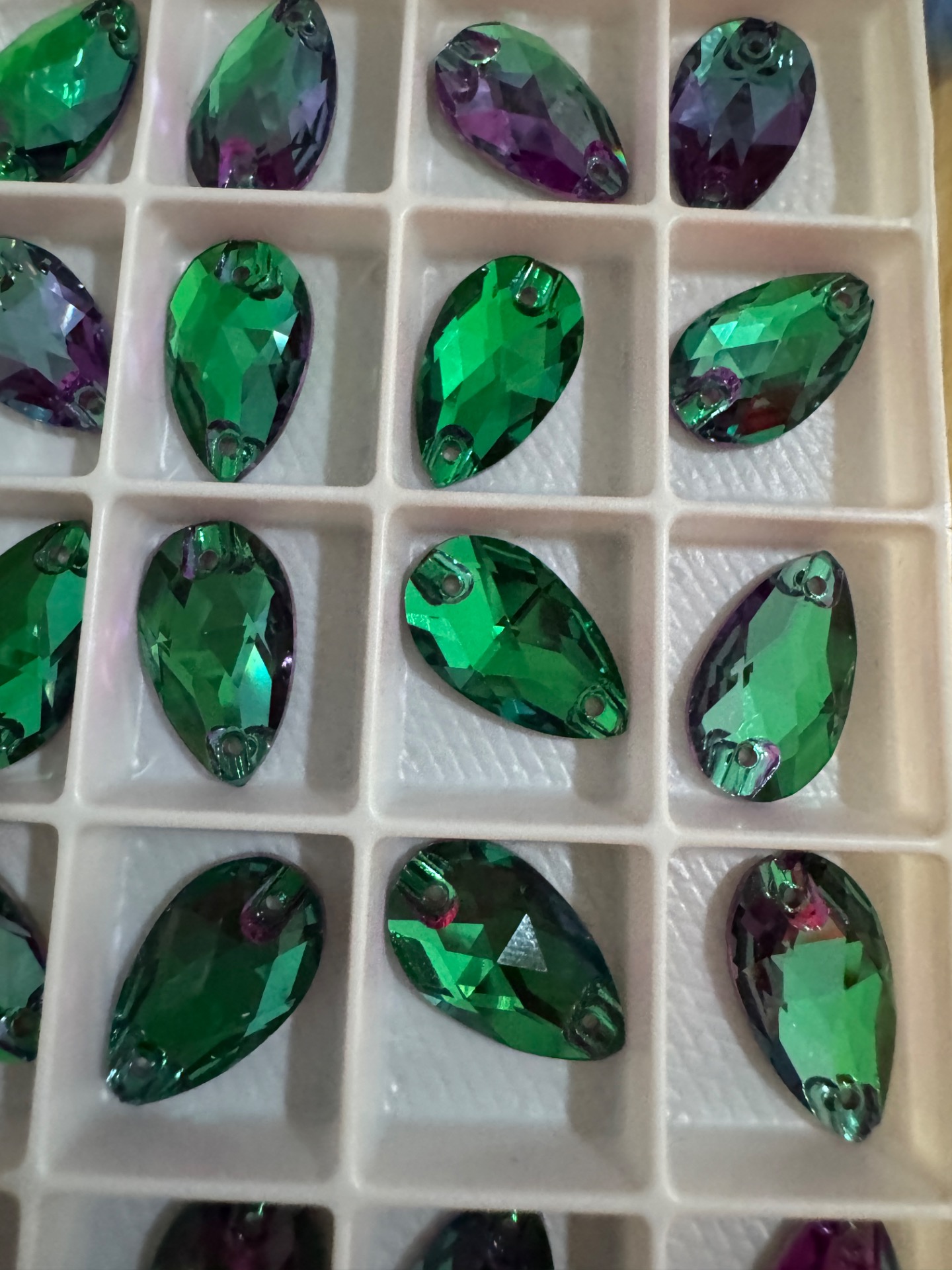 Modelo en Lagrima Color Esmeralda AB ( con destellos morados y rosas ) Material : En cristal ALTA CALIDAD Respaldo plano2 Agujeros para coser