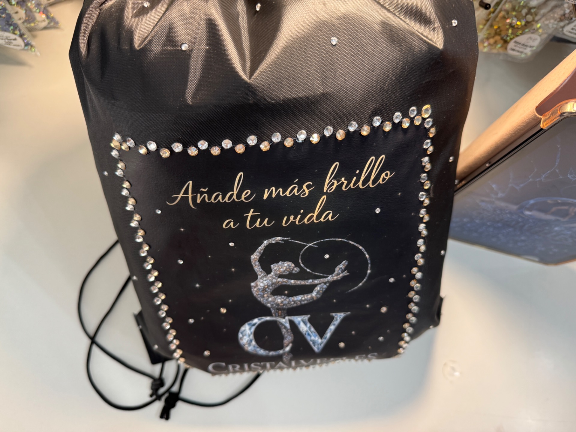 Lleva tu estilo con elegancia con nuestra exclusiva mochila Cristalvelles, decorada a mano con cristales que capturan la luz y reflejan tu pasión por la gimnasia.